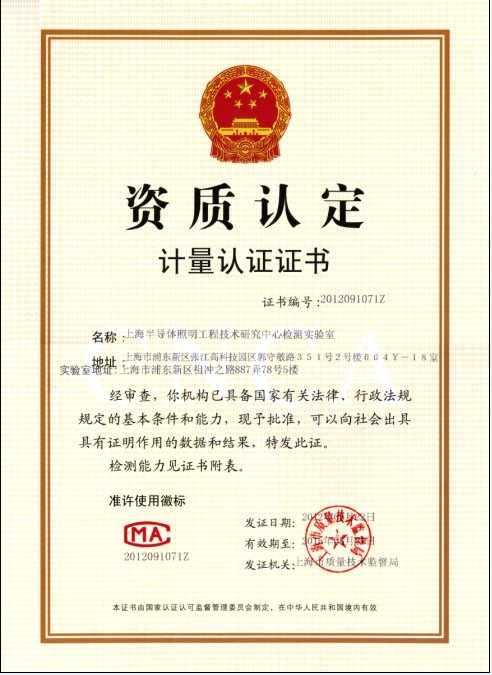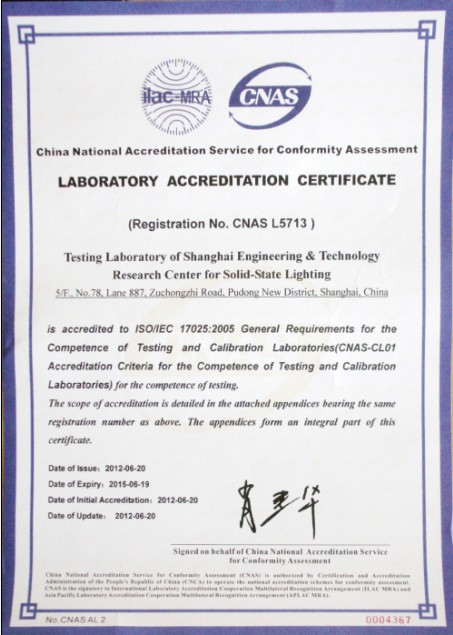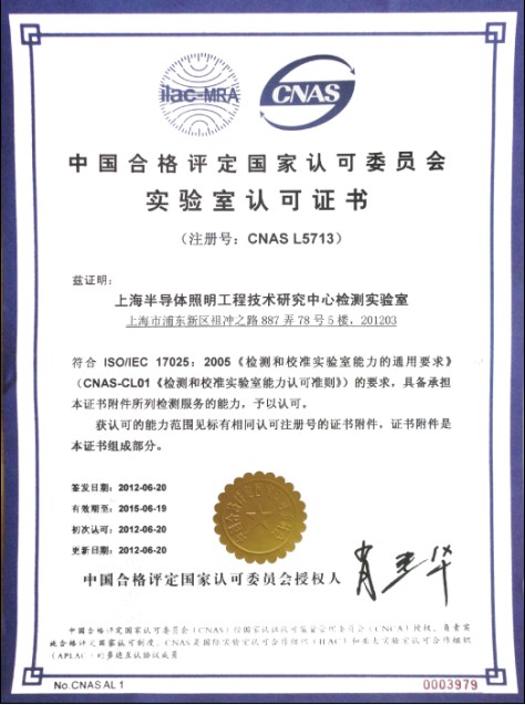 上海半導(dǎo)體照明工程技術(shù)研究中心檢測實驗室於2012年5月22日獲得中國計量認證CMA資質(zhì);於2012年6月20日正式獲中國合格評定國家認可委員會(CNAS)檢測實驗室能力認證(注冊編號:L5713)。