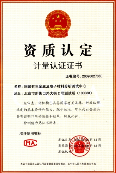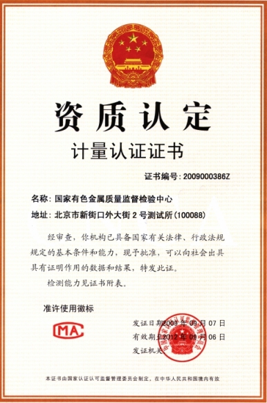 國家級資質(zhì)認(rèn)定計量認(rèn)證證書,CMA 2009000386Z;
