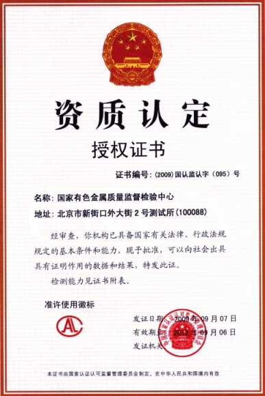 有色金屬標(biāo)準(zhǔn)樣品定點研制單位,YSRK07-2009;