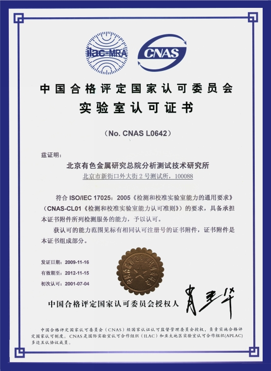 中國合格評定國家認(rèn)可委員會實驗室認(rèn)可證書,CNAS No. L0642;