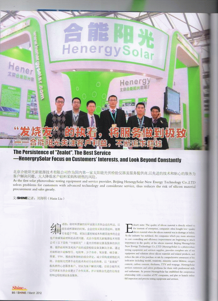 編者按:硅材料質量的好壞直接關系到企業的利益,以前在硅料緊缺的時候,企業經常買到劣質硅料。隨著行業趨于平穩,更加注重控制成本和提高效率的企業也開始重視硅材料的品質問題。北京合能陽光新能源技術有限公司(以下簡稱“合能陽光”)是光伏檢驗儀器及服務的供應商,提供硅材料及相關產品的成套檢驗設備及解決方案,通過對硅料硅片硅棒型號、電阻率、少子壽命、氧含量、碳含量、厚度、TTV、翹曲度等指標的綜合評定,減少采購或銷售的風險。合能陽光憑借專業的技術和對行業的熱情,以“發燒友”般執著的心態服務客戶,切實為客戶解決問題。目前合能陽光已同多家光伏企業建立了合作關系,并計劃推出先進的在線全檢和過程檢測設備及服務。